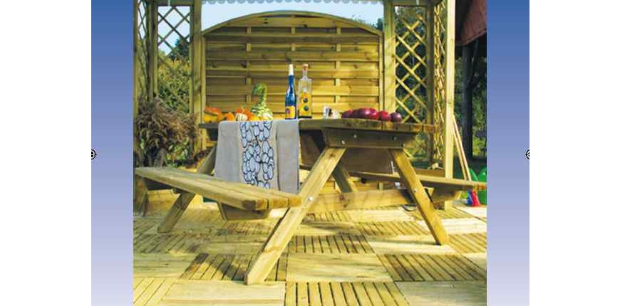 Kącik do grillowania powinien mieć utwardzoną i równą nawierzchnię, zaś w pobliżu paleniska musi być ona niepalna. W ogrodzie najbardziej naturalnym materiałem jest drewno, dlatego możemy wykorzystać deski lub gotowe elementy, z których wykonamy podłogę. Dostępne są podesty o kształcie prostokąta lub sześciokąta. Oczywiście materiał musi być zabezpieczony impregnatem – najlepiej aplikowanym ciśnieniowo w autoklawach. Dlatego kupując podesty sprawdźmy, czy zostały fabrycznie zaimpregnowane. Podłoga będzie bardziej trwała, jeżeli z zajmowanej przez nią powierzchni usuniemy darń, a powstałe zagłębienie wypełnimy żwirem. Powierzchnię tej podbudowy należy starannie wypoziomować.