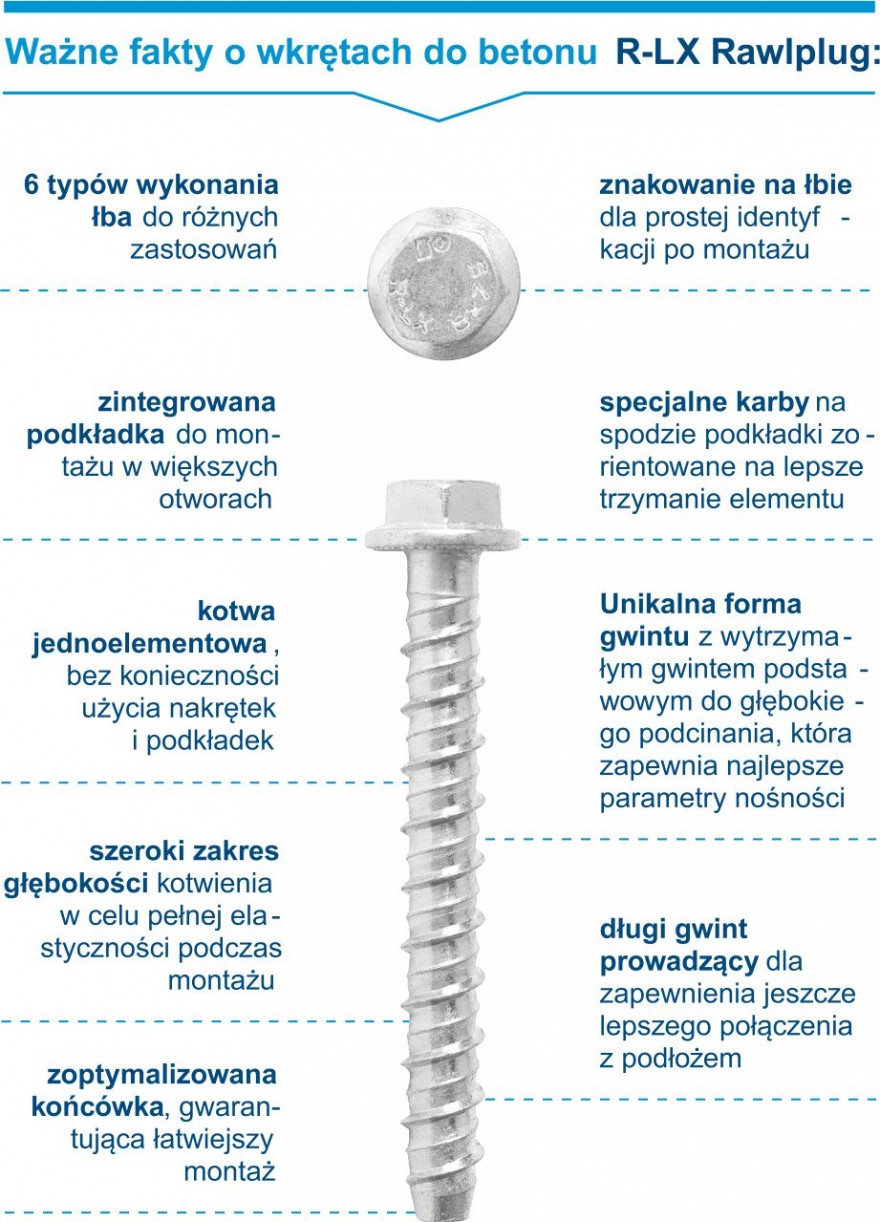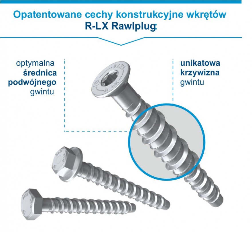 Rawlplug po raz kolejny postawił na innowację, a co za tym idzie – autorskie rozwiązanie. Ich wkręty R-LX posiadają gwinty o dwóch różnych skokach. To główny gwint odpowiada za podcięcie materiału, co pomaga efektywnie rozprowadzić działające na niego siły, co przesądza o wysokich nośnościach kotwy. Pomocniczy gwint dolny umożliwia natomiast stabilizację kotwy w trakcie montażu, jednocześnie podnosząc jej wytrzymałość na siły ścinające. Ale to opatentowane cechy konstrukcyjne Rawlplug: optymalna średnica podwójnego gwintu oraz jego unikatowa krzywizna zapewniają tym produktom niepowtarzalne parametry i funkcjonalność. Podczas montażu kotew wkręcanych R-LX Rawlplug zachodzi podcinanie wywierconego otworu, który jednocześnie wypełniany jest pozyskiwanym urobkiem. Zachodząca w tym czasie wtórna hydratacja dodatkowo wzmacnia właściwości nośne, ponieważ wkręt Rawlplug po prostu spaja się ze swoim podłożem.